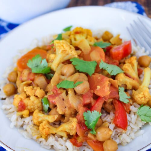 Pour in the diced tomatoes, coconut milk, and chickpeas. Stir well, bring to a gentle simmer, and let cook for 15-20 minutes until the cauliflower is tender. Add vegetable broth if needed to adjust consistency.