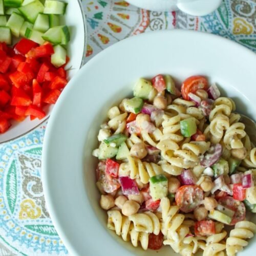In a large bowl, assemble the salad by combining the cooked and cooled pasta, cherry tomatoes, cucumber, red onion, Kalamata olives, red bell peppers, chickpeas, and vegan feta (if using). Pour the dressing over the salad and toss it gently to coat everything evenly.